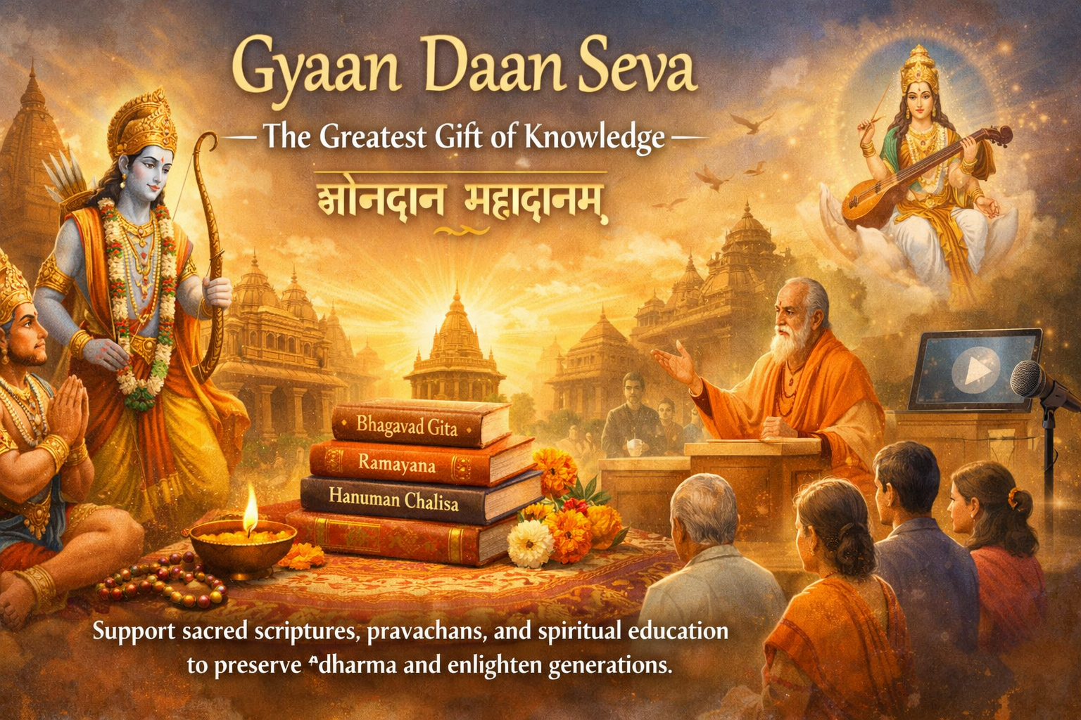 Gyaan Daan Seva is the sacred act of donating knowledge for the welfare of society. In Sanatana Dharma, sharing wisdom is considered the highest form of charity, as it enlightens minds, strengthens faith, and guides humanity toward righteous living.
